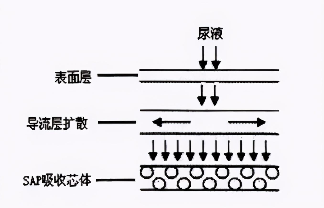 寶寶排出的尿液,被紙尿褲的表層接收后會(huì)向下滲透,然后沿著導(dǎo)流層擴(kuò)散到吸收層,后被高吸水樹脂(SAP)吸收。