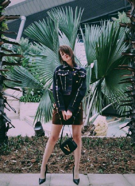 look5 黑色牛仔外套+棕色皮褲甜美風(fēng)和氣質(zhì)風(fēng)都很適合喬欣,其實(shí)喬欣更加適合街頭暗黑酷帥風(fēng),搭配一件黑色的鉚釘牛仔外套+小短裙,簡(jiǎn)直潮爆了,露出大長(zhǎng)腿,颯氣十足,又A 又欲的街頭潮酷風(fēng)穿搭,這樣的喬欣你覺得可嗎?