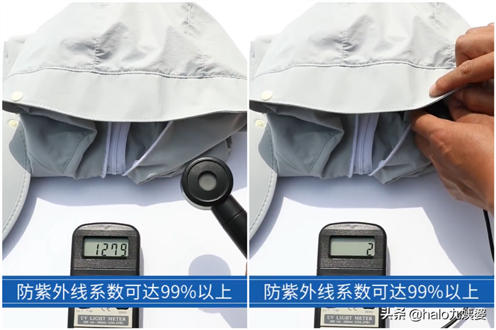 然而帽檐的防曬指數(shù)更高,陽(yáng)光直射下,紫外線強(qiáng)度為1458,而防曬衣下紫外線強(qiáng)度甚至為0,防曬效果達(dá)到滿分~