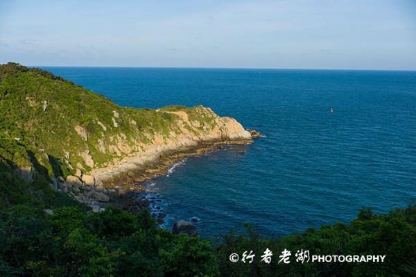 看完日出,可以到雞冠石邊上的情人島走一圈,不過在礁石之間有一個鋼筋做成的橋已經(jīng)被海浪沖垮了一半,站在上面十分危險。但是這里可以看到雞冠石和我們即將要去等登的放雞島的山頂。從這里可以看出,放雞島的森林覆蓋率確實無愧為廣東第一。