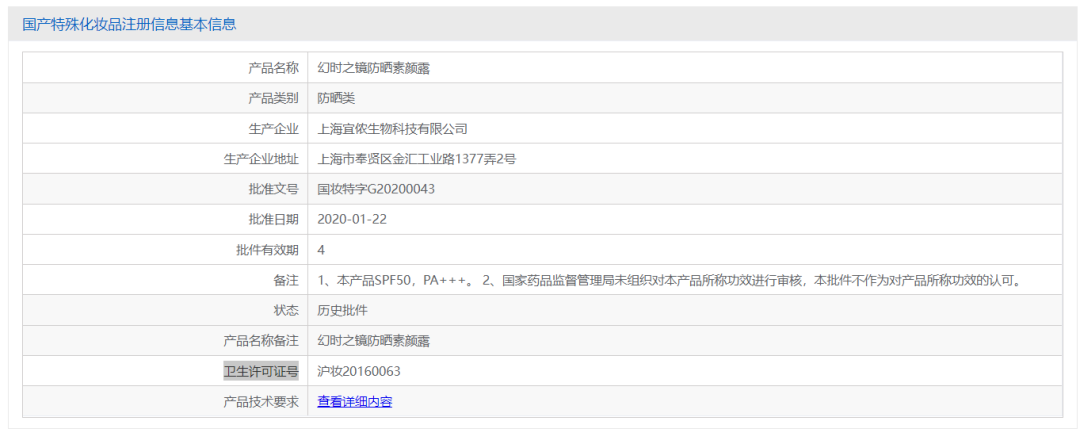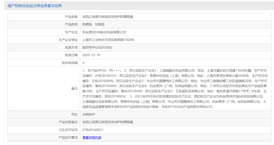不過,在藥監(jiān)局官方上查到該噴霧產(chǎn)品有專屬的特證國妝特字G20203062,有效期是4年,所以這兩個(gè)產(chǎn)品并沒有用同一特證。