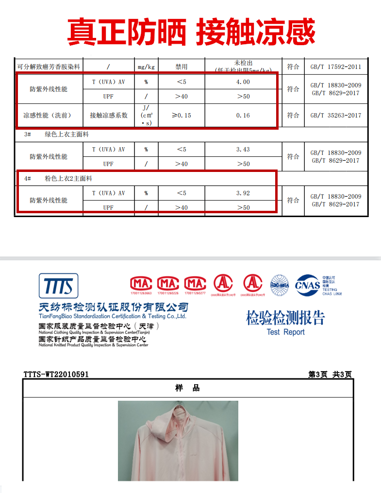 更重要的是它防曬能力真的十分抗打!按紡織品防紫外線標準規(guī)定:當防曬數(shù)值UPF>40,且T(UVA)平均值小于5%,才能稱為“防紫外線產(chǎn)品”。
