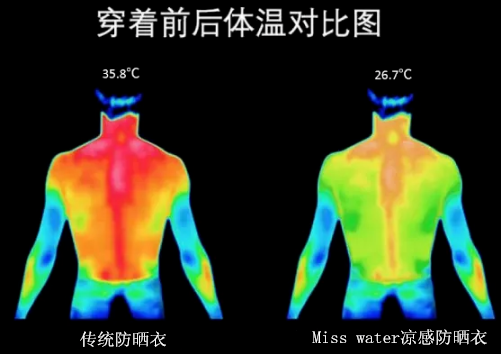 做了組對比測試,在熱成像設(shè)備下,這款涼感防曬衣的溫度要比普通防曬衣低了好幾度。