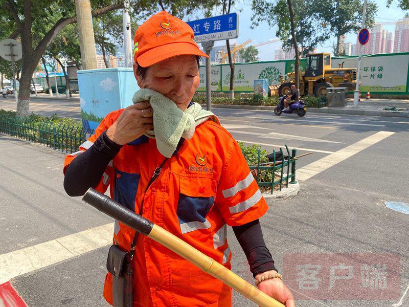 7月14日下午三點多,熾烈的陽光烘烤著大地,溫度計指向36攝氏度。鄭州市金水區(qū)紅專路上,58歲的環(huán)衛(wèi)工謝艷接了上一班的崗,換上橙色工作服,開始忙碌起來。