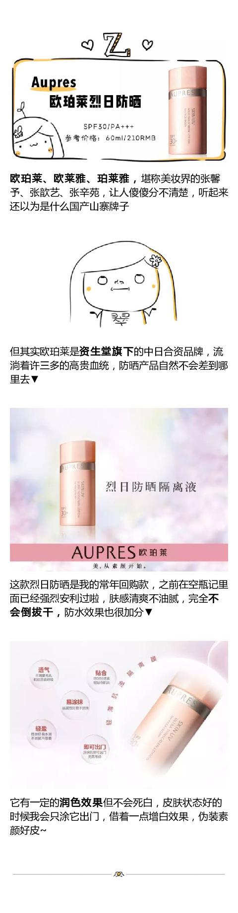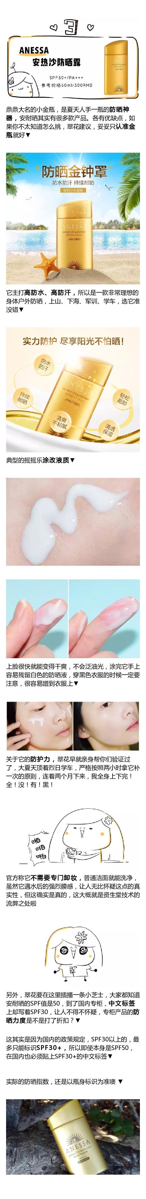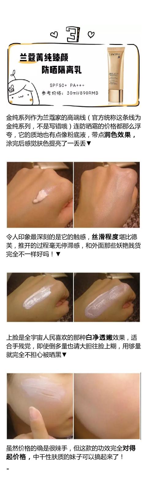 對廈門這種春秋天也曬得要死的地方,至少可以用作三個季節(jié)的防曬。再搭配一個SPF30左右的防曬用來室內(nèi)或陰雨天使用就足夠了。我剛剛買了曼秀雷敦新碧粉瓶SPF30的,也是免卸的,便宜好用,畢竟我窮嘛!