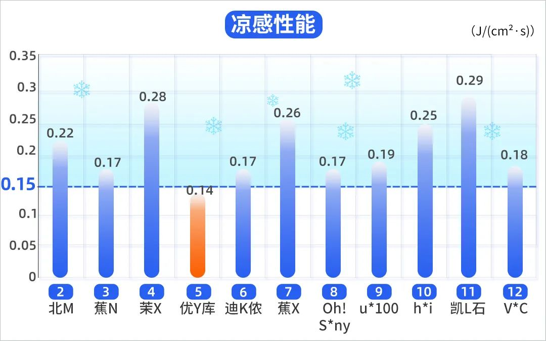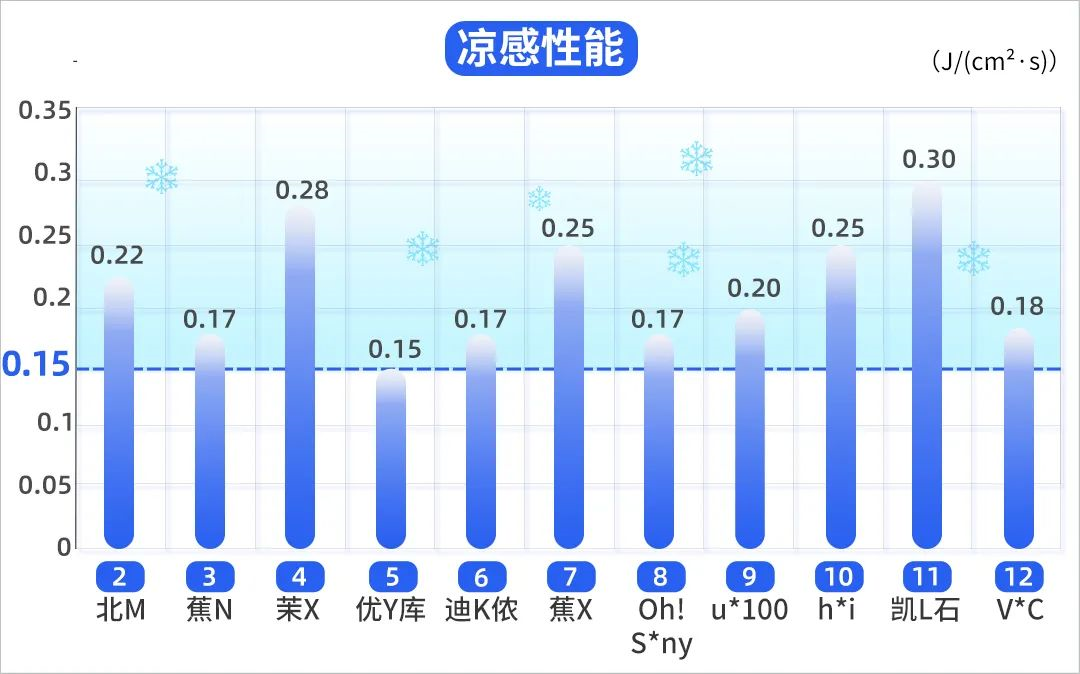 柱子越高,代表皮膚感受到的涼感越強。可以看到,11 款防曬衣都具有“接觸瞬間涼感性能”。