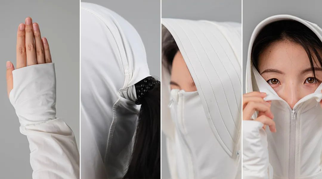 現(xiàn)在的防曬衣,防曬帽檐、護臉設計、發(fā)洞、指洞基本上都是標配了。