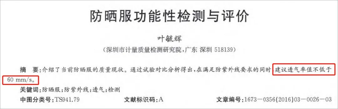 對防曬衣來說,在防紫外線的前提下,透氣率越高越好。有文獻建議,透氣率值應不低于 60mm/s。