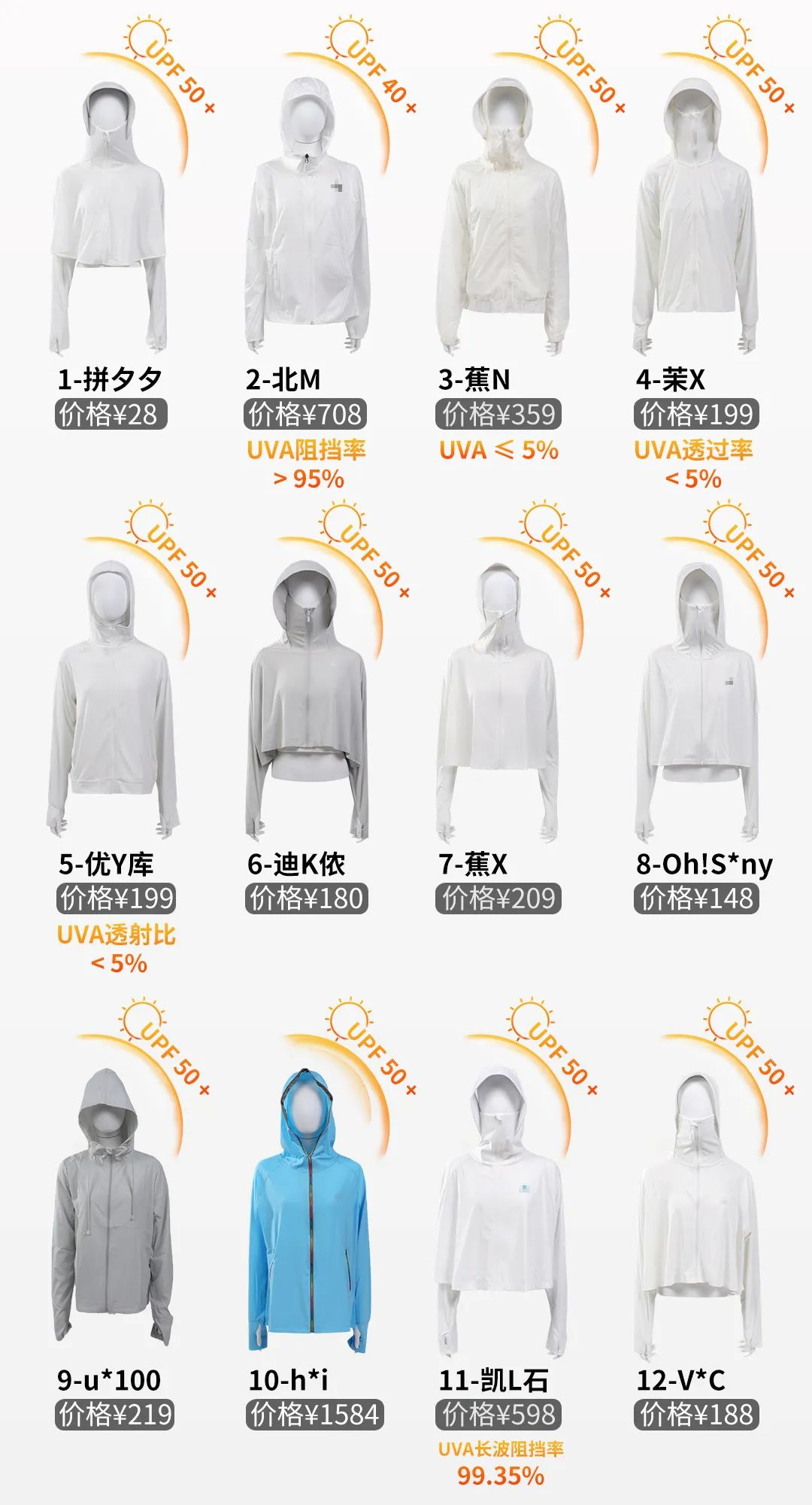 綜合各平臺銷量,我們在官方旗艦店購買了 12 款熱門防曬衣,價位從 28 元到 1500 元不等。全家福如下: