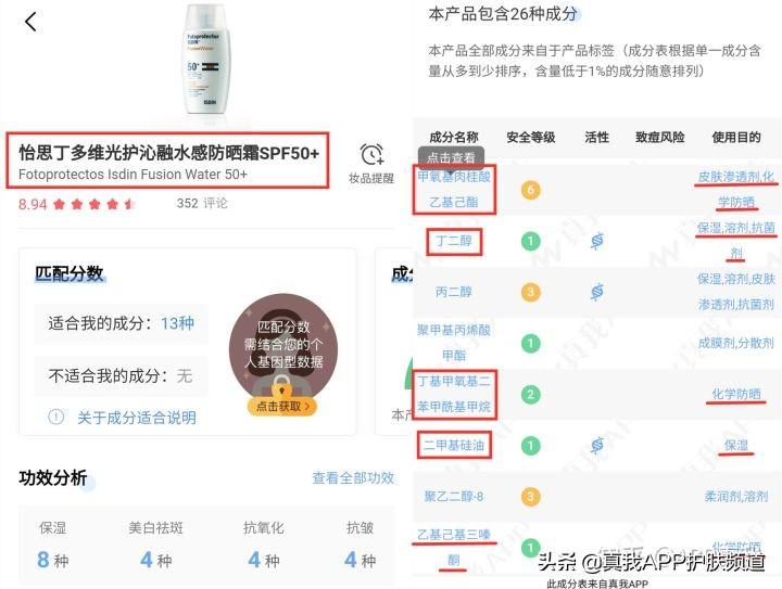從真我APP上查詢的成分表來(lái)看,主要為功效成分就是保濕。雖然兼具物理防曬和化學(xué)防曬,但以化學(xué)防曬為主,不會(huì)出現(xiàn)泛白。丁二醇鎖水保濕,還抑菌消炎。