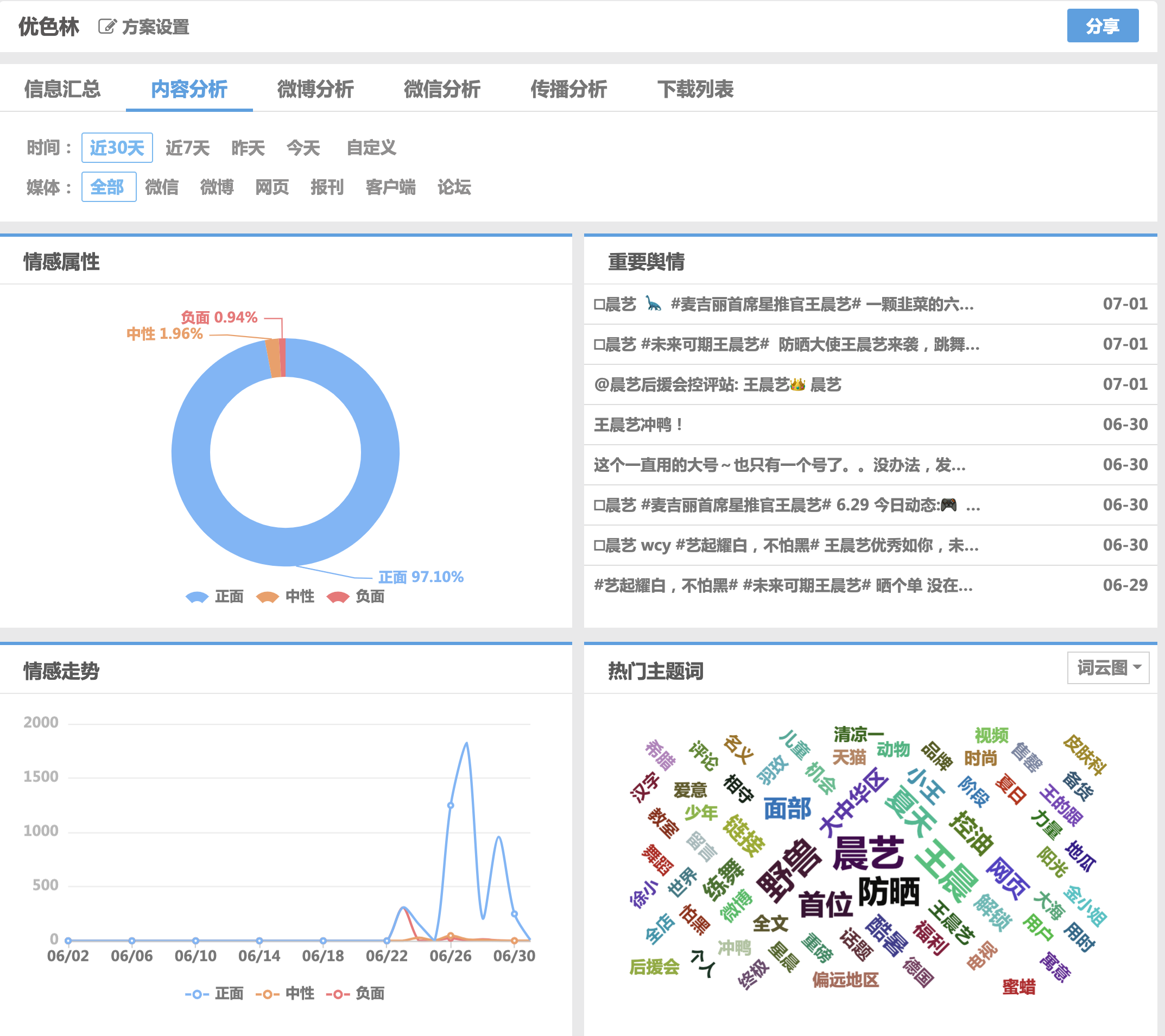 優(yōu)色林防曬乳液在當(dāng)天開售10小時,銷量突破6922瓶,銷售額達(dá)到97萬元。銷量之外,品牌和產(chǎn)品好評如潮,粉絲把對藝個人的好感直接轉(zhuǎn)移到品牌和產(chǎn)品上。從清博大數(shù)據(jù)的輿情監(jiān)測看,品牌關(guān)鍵詞正向評價內(nèi)容占比達(dá)到97%以上,品牌取得極高好評。